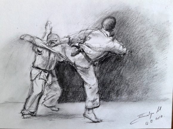 Slide to the side (tenshin), away from opponents punch (neko ashi dachi) and grab his arm (kake uke). From this position kick to the opponent’s groin is logical choice. Use your front leg and do not try to put too much force into this movement. Kinteki geri is based on whipping motion. Forget those high, roundhouses and spinning kicks, they are not practical.
