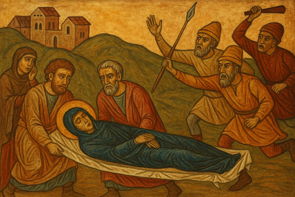 Dakle da rezimiramo. Bogorodica se pred smrt bojala da će jevreji njeno telo spaliti posle smrti. Jevreji su slali vojsku da spale njenu kuću, pokušali su da prevrnu njen kovčeg i da oduzmu telo. Vojsku su poslali u Vitlejem da zaustave pogreb. Međutim, pred njenu smrt sazvani su apostoli da pomognu, pa je nakon smrti njeno sveto telo tajno preseljeno iz Vitlajema ka Jerusalimu gde je bio episkop Grigorije.