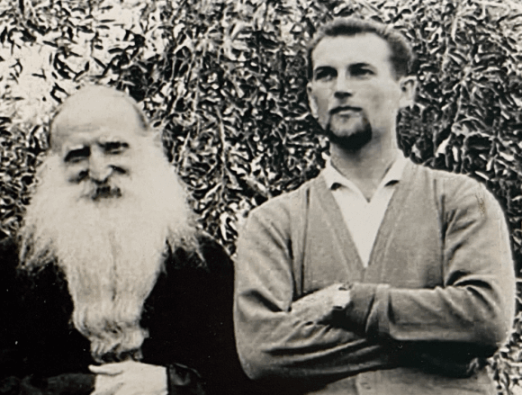 Sveti Tihon Svetogorac bio je duhovnik Svetog Pajsija Svetogorca. Profesor Petrović je zamolio starca da se slikaju. Starac je radio nešto oko bašte i bio je vezao bradu u čvor. Za slikanje je odvezao taj čvor pa se to i može primetiti na slici.
