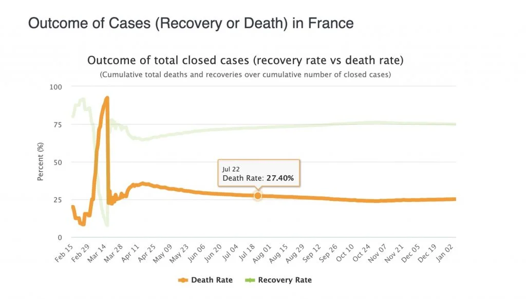 Interesantan je i način računanja smrtnosti u Francuskoj. Oni na tabeli pokazuju oko 25%, ne znam i mrzi me da ulazim u detalje. Pretpostavljam da računaju prema broju ozbiljno obolelih.
