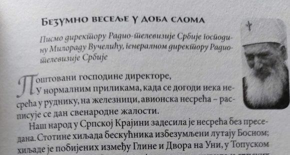 Ne volim da komentarišem ovakve stvari ali podsetio bih javnost na jedno drugo pismo patrijarha Pavla koje je takođe upućeno gospodinu Miloradu Vučeliću u trenutku kada je 300.000 Srba u kolonama bežalo iz Krajine, a kada je na RTS-ovim kanalima bila muzika i totalno pomračenje informacija.