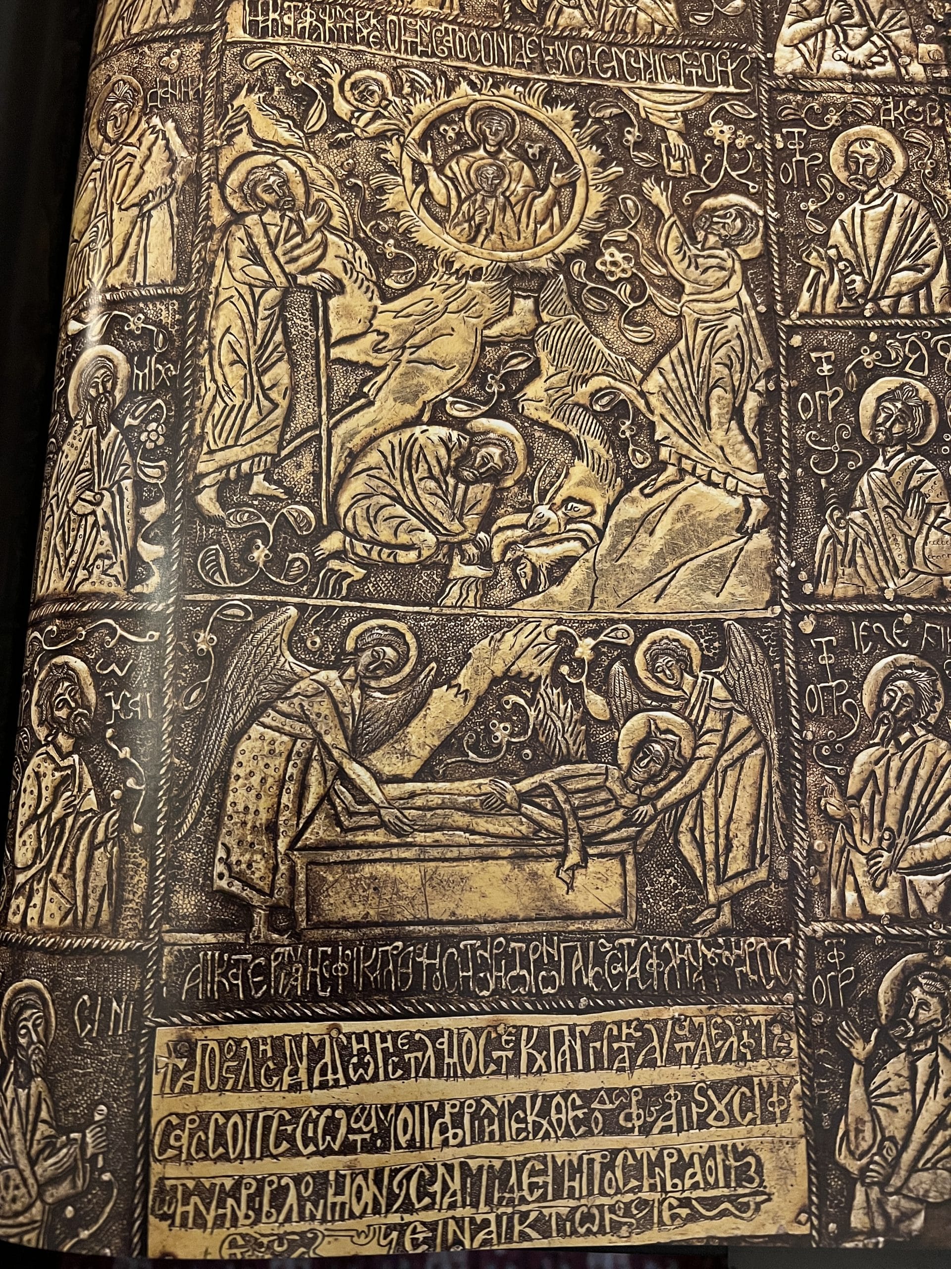 Јеванђеље из 1587. године, богато украшене корице на којима Мојсије даје воду својим животињама и прима таблице са заповестима. Натпис старословенским вјазом.