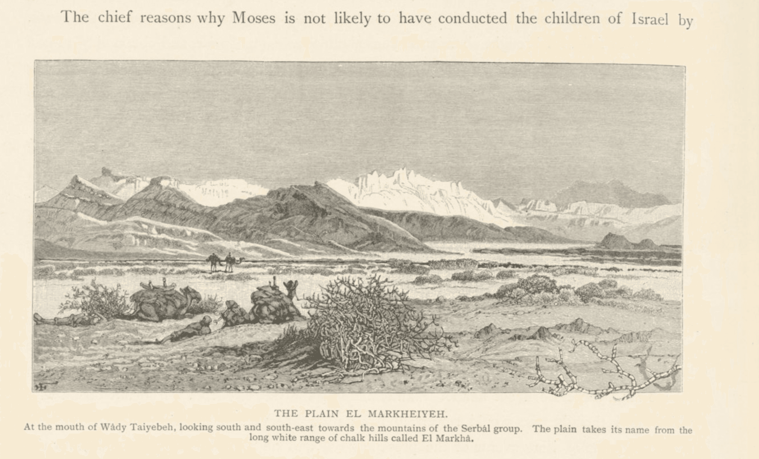 The plain El Markeiyeh. At the mouth of Wâdy Taiyebeh, looking south and south-east towards the mountains of the Serbál group. The plain takes its name from the long white range of chalk hills called El Markhâ.