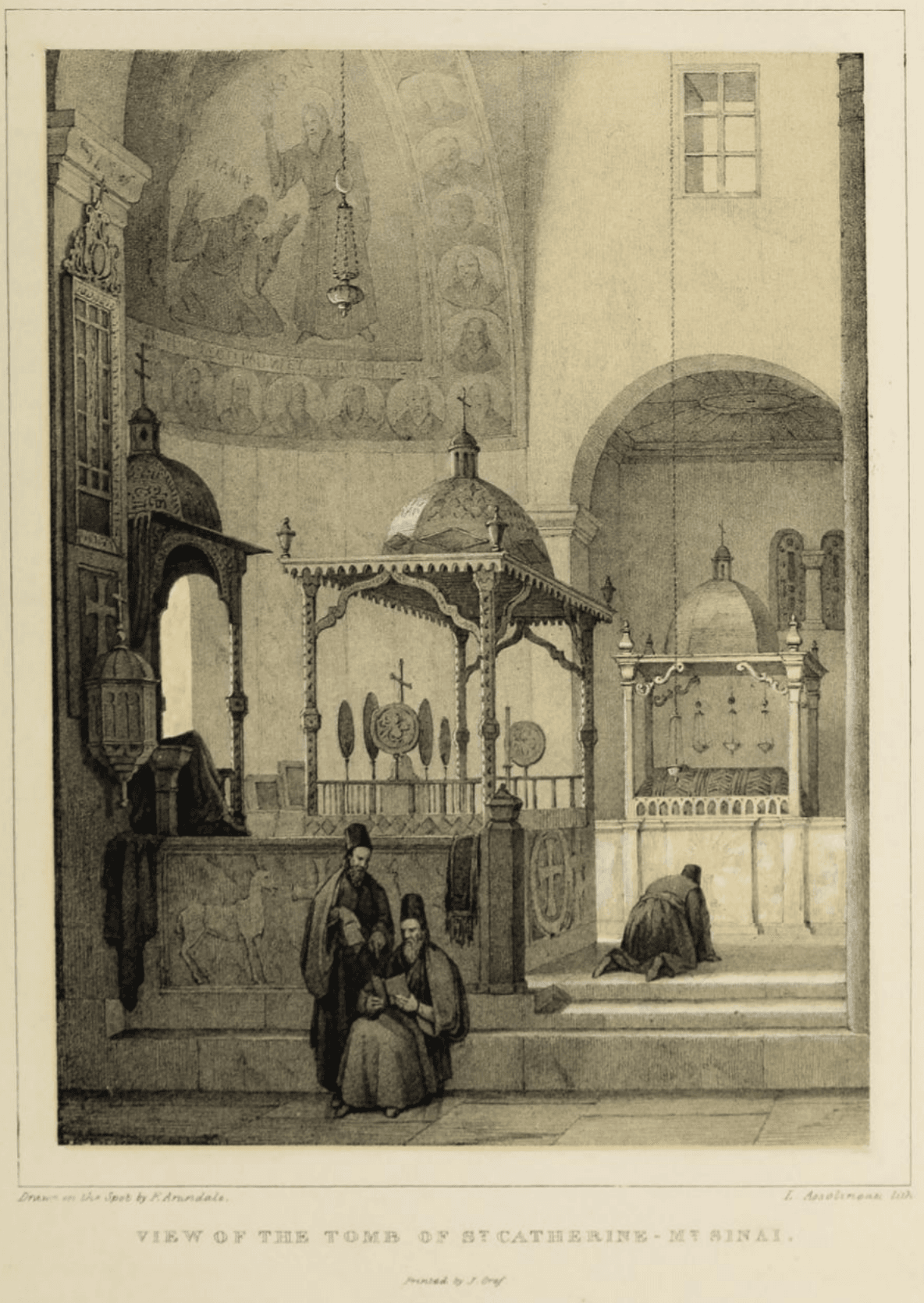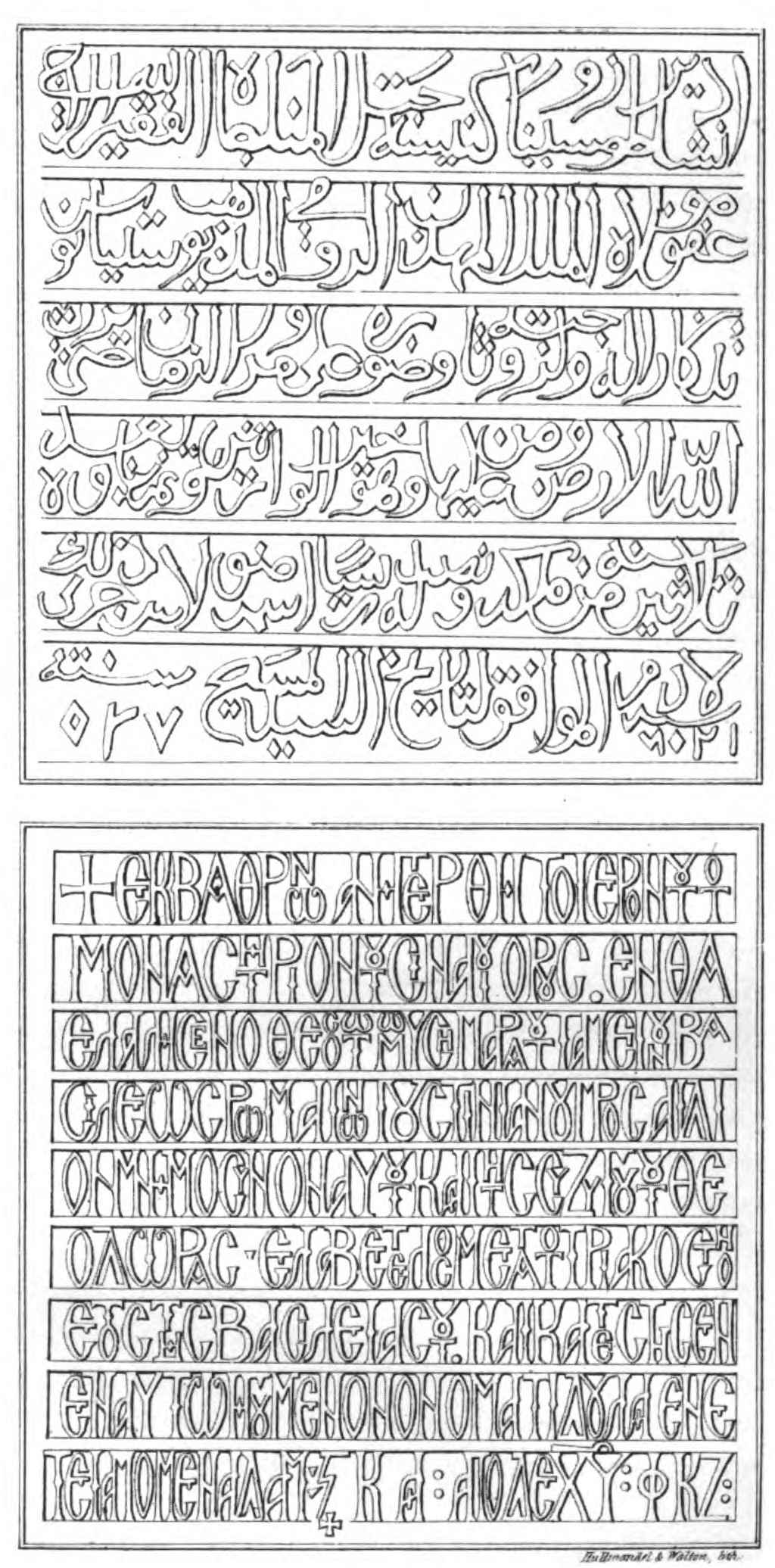 Натпис на северном зиду манастира Св. Катарина на арапском и грчком где се помињу Јустинијан и Теодора као оснивачи манастира. Сликао немачки историчар Лепсиус.