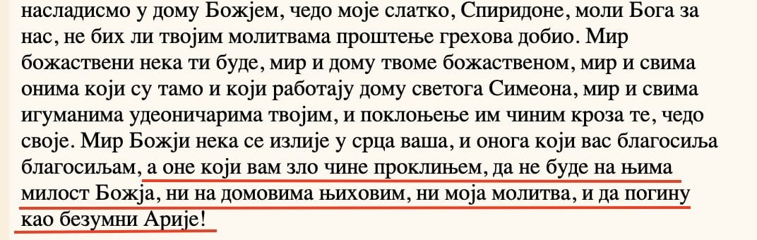 ”… а оне који вам зло чине проклињем, да не буде на њима милост Божја, ни на домовима њиховим, ни моја молитва и да погину као безумни Арије!”