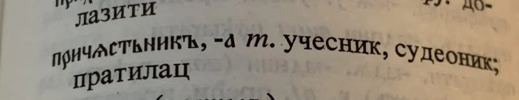 Starosrbski rečnik kaže da je ”pričestjanik” – učesnik. Čest je deo, pa mi kažemo recimo ”na ravne časti” kada se nešto deli.