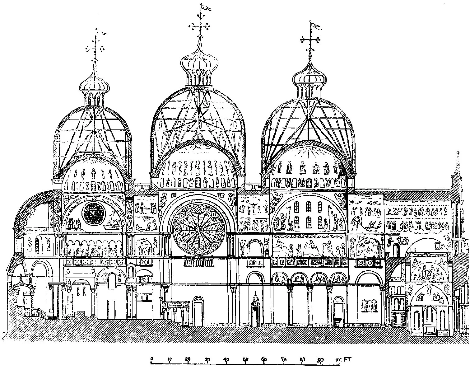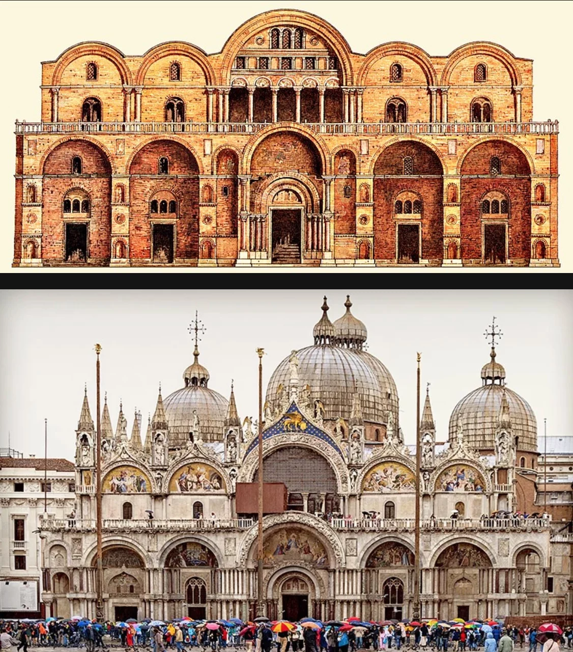 The Venetians tried their hardest to make their new church resemble Hagia Sophia, but even with all the stolen wealth, they couldn’t replicate the domes built by Justinian in Hagia Sophia. The domes of St. Mark’s Basilica are fake, as you can see in the church’s plan.