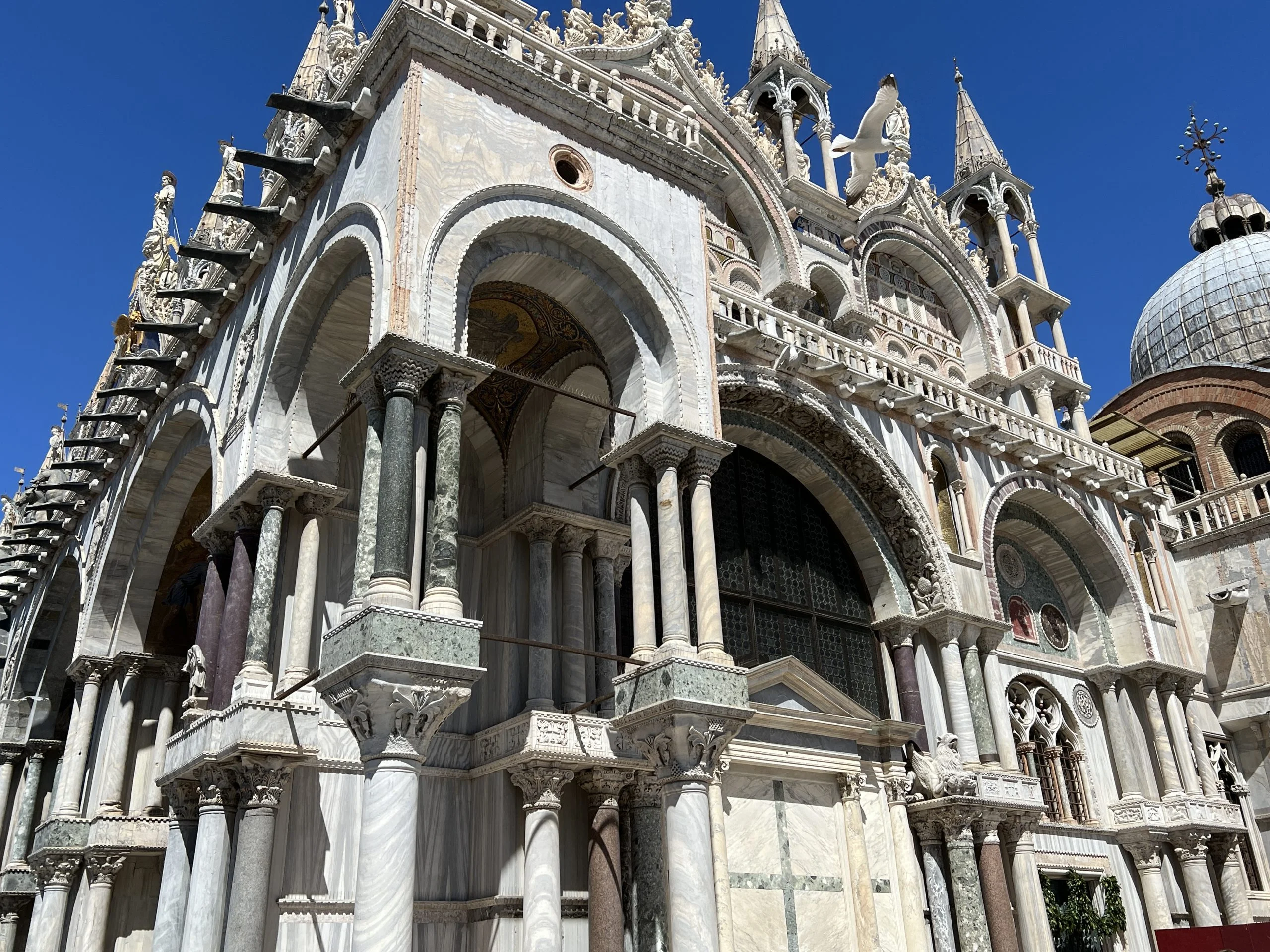 When the relics arrived in Venice, they were placed in the old basilica, which was previously dedicated to St. Theodore. That church was made of wood and burned down, so a new basilica was built for St. Mark’s relics. Initially, the basilica wasn’t particularly special until the conquest and looting of Constantinople when it became crammed with artworks, columns, statues, and gold.