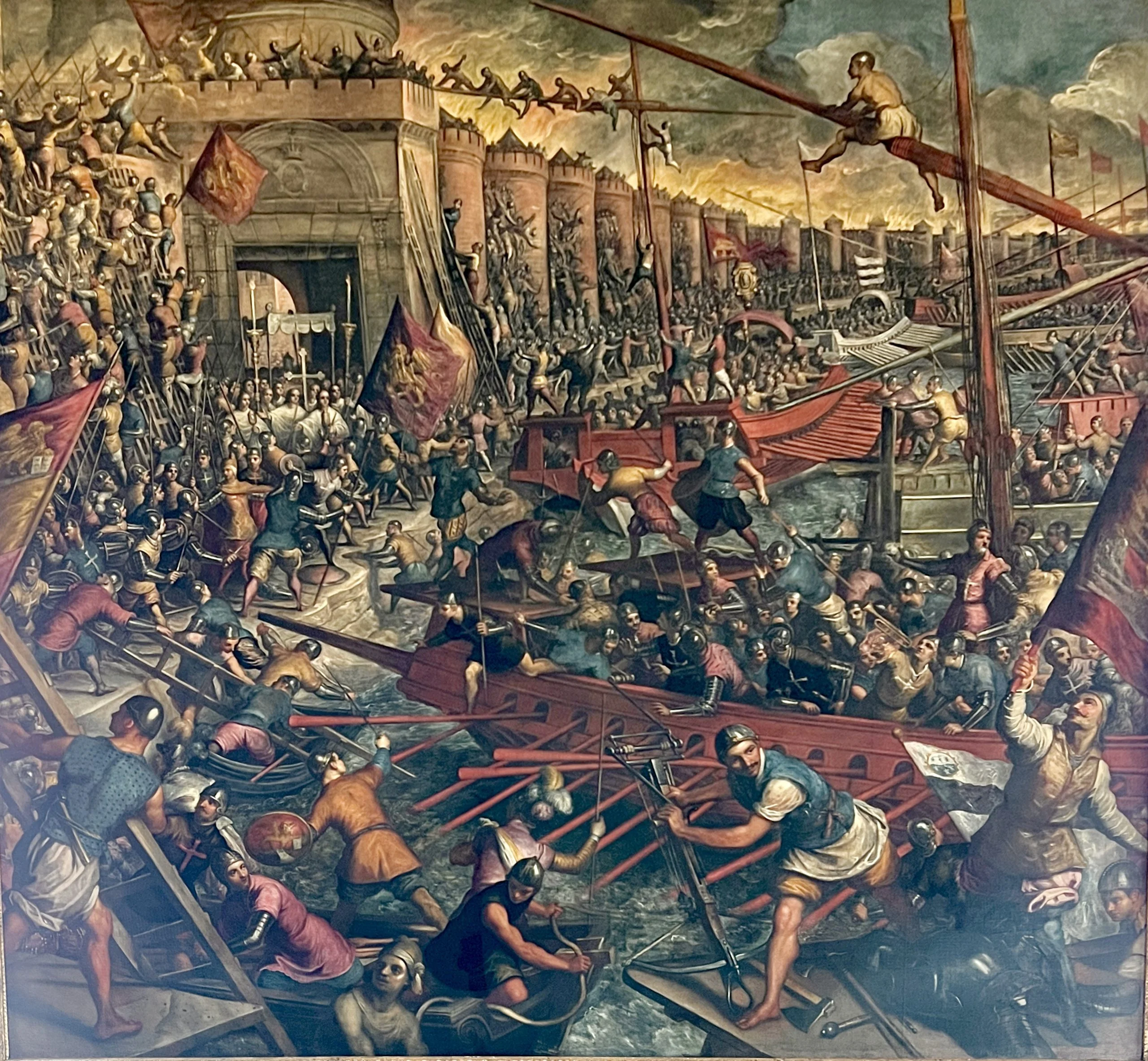 In this painting, the scenes of battles on the walls of Constantinople can be clearly seen, with Crusaders, who sailed from Venice, climbing the walls and jumping from the masts of galleys onto the city’s walls. Byzantine chroniclers of that time confirm these scenes.