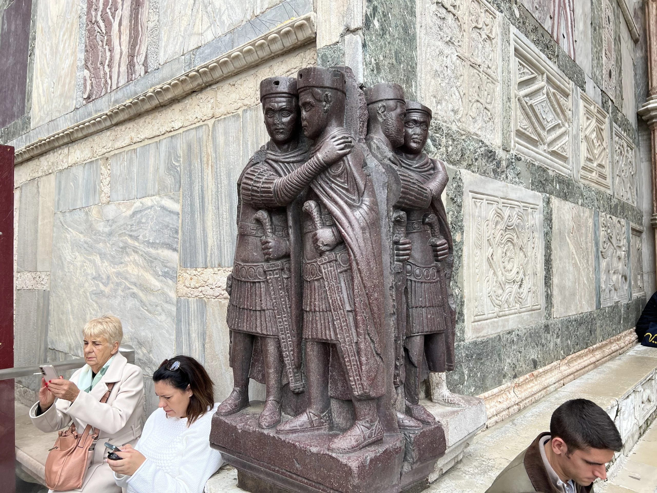 This is the famous Tetrarchy sculpture from the main square in Constantinople. It was made during the time of Diocletian (300 AD) who introduced the concept that, due to the size of the empire, four rulers should reign. Two emperors (Caesars), one in the east and one in the west, each with their own deputy (Augustus). Diocletian appointed Maximian as the emperor of the eastern part and then they both chose Galerius and Constantius (the father of Constantine the Great). All four were from the Balkans and the sculpture is made of porphyry, stone that only the Roman emperors were allowed to use. This sculpture is depicted in all history textbooks worldwide. It has been in Venice since the 13th century.