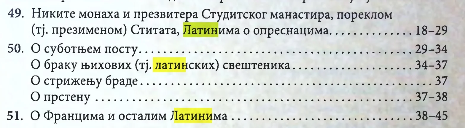 Međutim, postoji poglavlje 51. u knjizi koje se konkretno bavi katolicima, tj. Francima i ostalim Latinima kako se u tekstu kaže i tu su oni jasno nazvani jereticima (strana 38. druga knjiga Zakonopravila, prevod Miodraga Petrovića). Tu nije kraj kritike latina već postoji još nekoliko tekstova koji se njima bave. Naveo bih ovde Glavu 49. Nikite monaha i prezvitera Studitskog manastira poreklom Stitata o Latinima o opresnicima (strana 19.), Glavu 50. O brakovima (strana 29.)