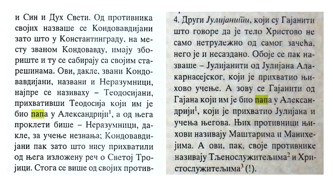 - Njihovi prezviteri i episkopi ne prave svešteničke rize od vune, nego se izatkanim crvenim svilenim nitima oblače, praveći ih ukrašene, mnogorazlično. Nose i prstenje i ruke oblače u rukavice. Na desnoj rukavici piše: ”Ruka kao iz oblaka”, a na levoj je napisano ”Jagnje Božje”. *** za razliku od skromnosti koju propoveda pravoslavlje, katolički sveštenici i episkopi su ukrašavali svoje odore što se smatralo padom u gordost.