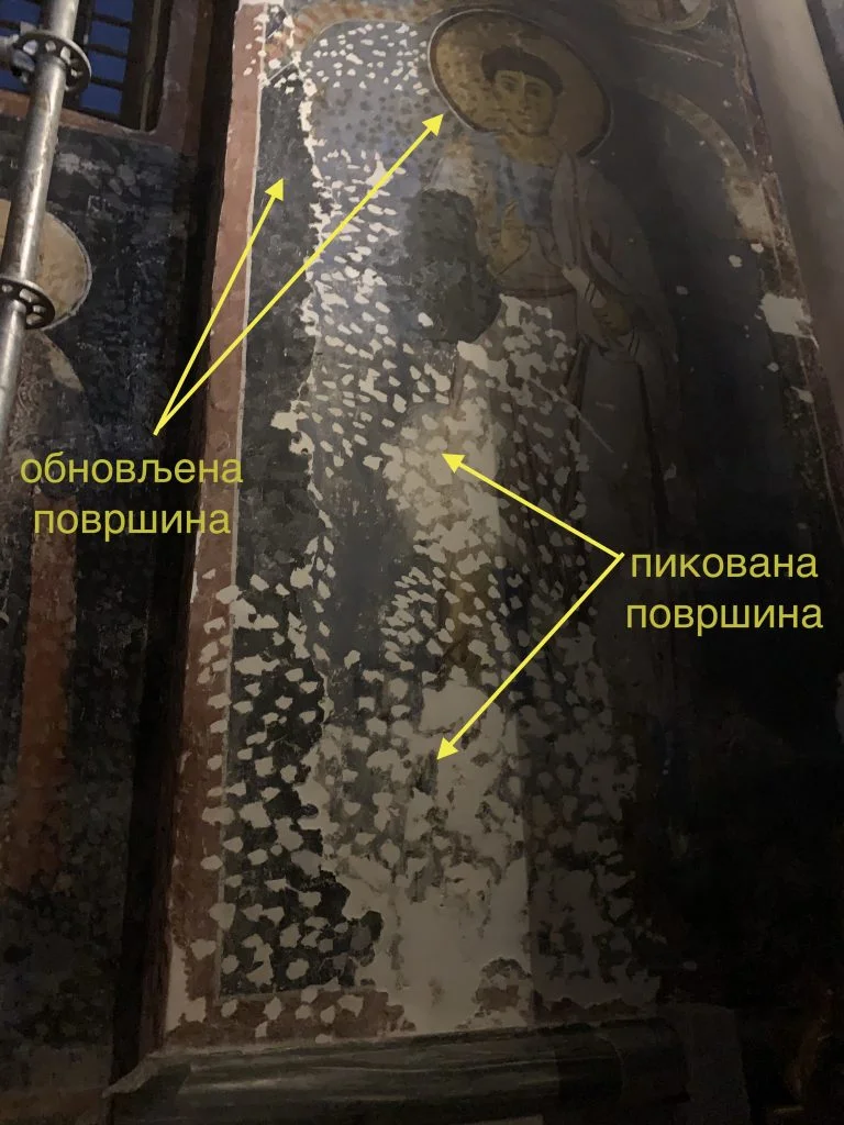 Obe crkve manastira su unutra pod skelama i od početka proleća do početka zime i restauratori rade na obnovi fresaka. Iskoristio sam priliku da dobijem objašnjenje zašto su freske u mnogim našim manastirima pikovane? Da li se radi o zaveri zavoda spomenika za vreme komunista da nam unište kulturno dobro ili su to radili Turci kako poneko kaže? Evo odgovora.
