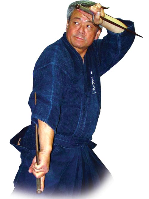 Oshiro Sensei poses in a kamae that demonstrates the concept of “kakushi buki” or concealment of the weapon. The idea behind it is that the opponent cannot tell exactly what you are holding and how long the weapon is. This gives one the advantage of surprise. Keep in mind that in the old days the normal dress was a kimono that had very long and baggy sleeves that could conceal a short weapon much better than a standard karate gi worn today.