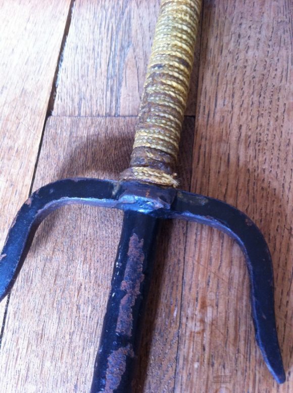 The basic holding manner “Honte-Mochi” (Natural) and “Gyakute-Mochi” (Reverse) is prevalent with basic Sai whereupon the advancement to “Toku-Mochi” (special grip) is introduced. This brings the usage and actions of the Sai into the same family as Tonfa and Kama. The Manji Sai which was made by Shinken Taira has a half reversed tang looking much like a swastika and a pointed pommel end denoting Sensei Taira’s preference to a stabbing motion instead of the smashing techniques dominant with the Tsuujo Sai.